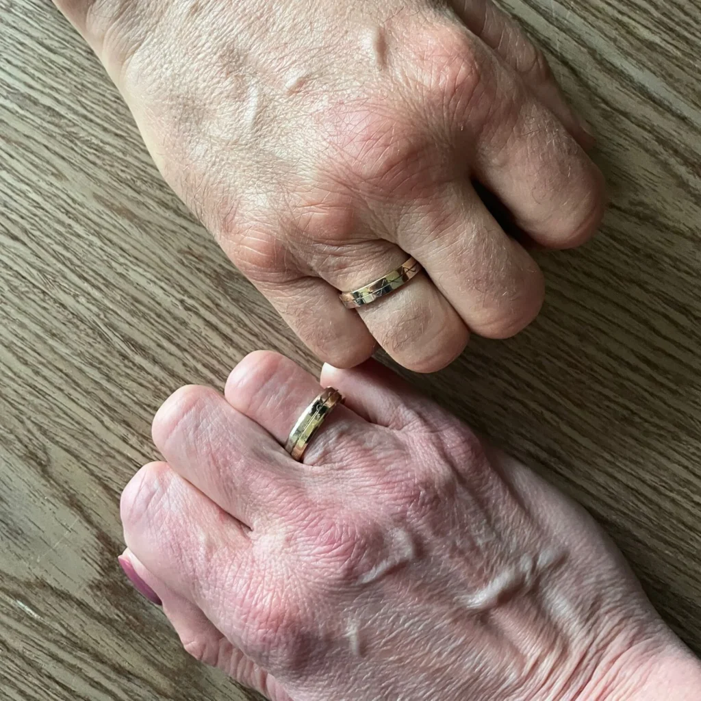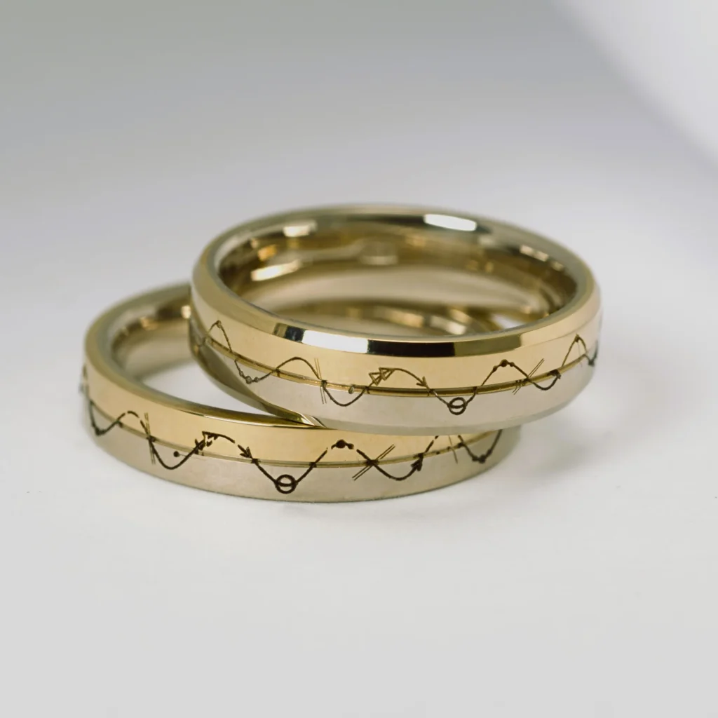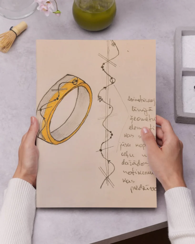 Aprunājoties pirmajā online tikšanās reizē ar Ligitu un Gunti, viņi smejot noteica: “Mēs esam tik dažādi, bet tomēr esam nodzīvojuši kopā tik daudzus gadus. Bērni jau izauguši…bet, ja tā jāpadomā – mēs paši īsti nesaprotam, kā tik ilgi esam kopā :)”. Tas bija tik patiesi un atklāti, ka tieši šī frāze kalpoja par pamatu mūsu idejai par gredzenu dizainu. Divas zelta krāsas līdzvērtīgā proporcijā, ar ārējo gravējumu, kas simboliski ataino viņu kopdzīvi, ar dažādiem dzīves notikumiem un pietur punktiem.