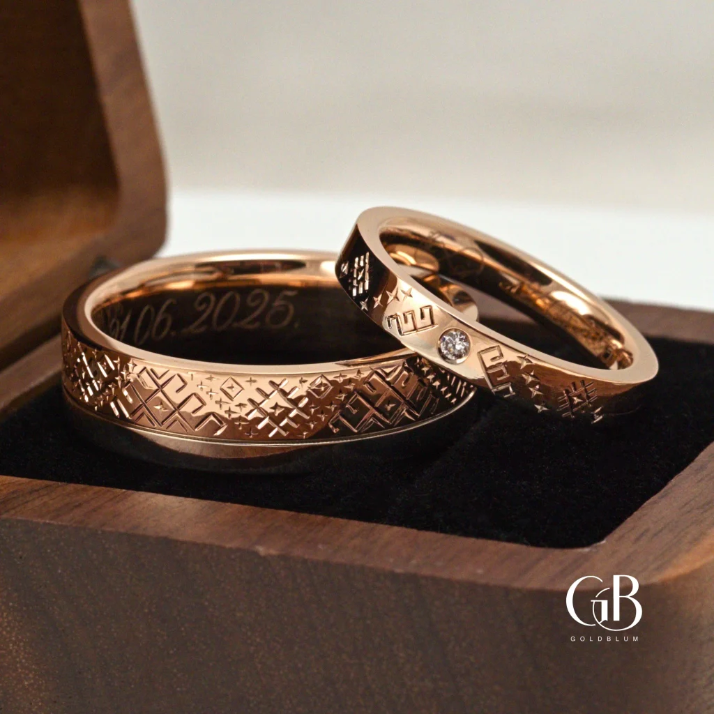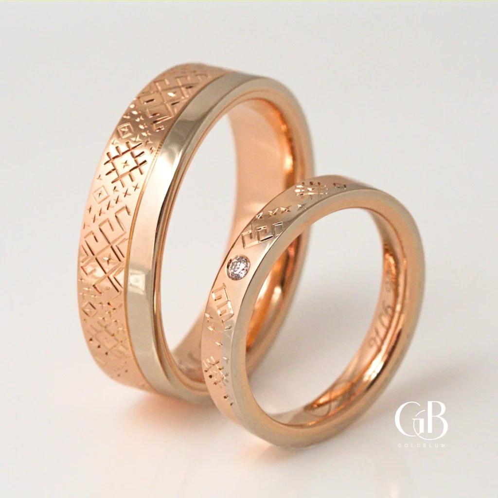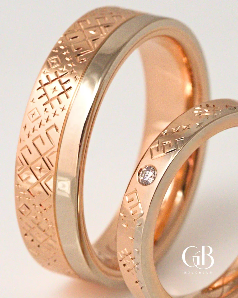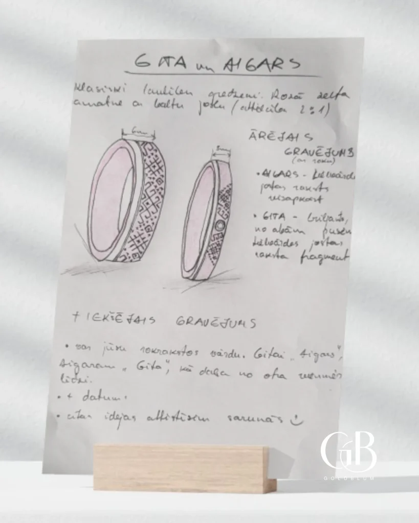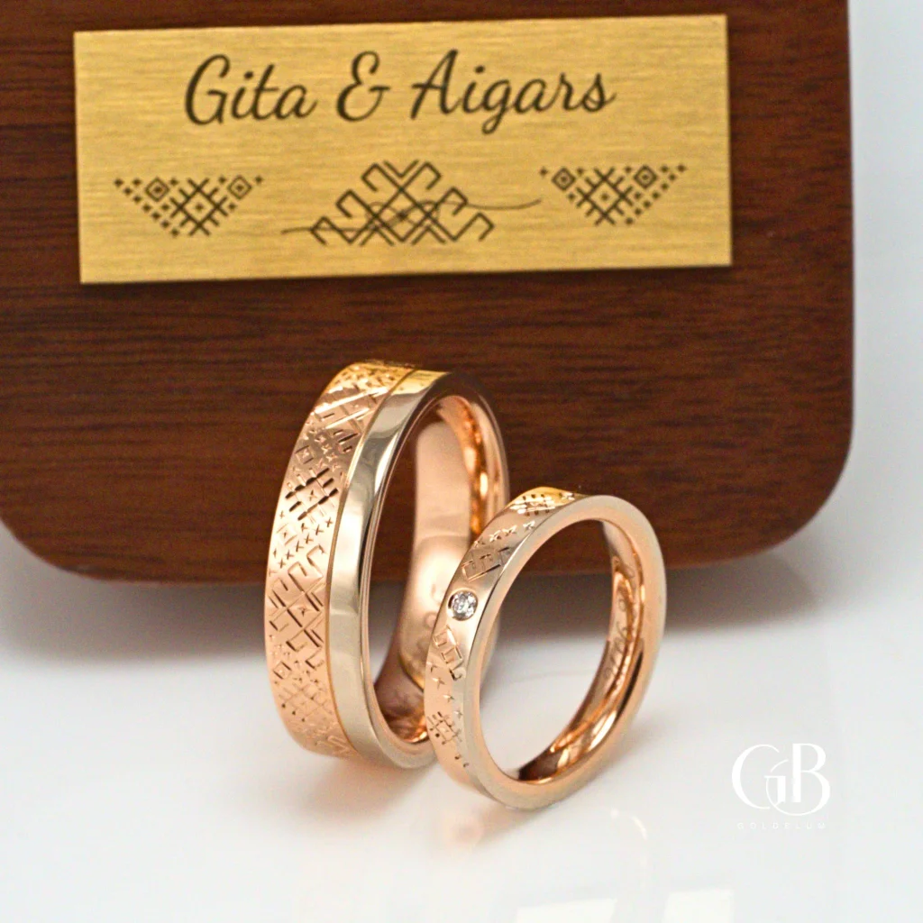 Tā kā līdzīga dizaina gredzenus jau bijām veidojuši iepriekš, sākotnējais virziens bija skaidrs. Aigaram – platākā rozā zelta daļā ar roku iegravēts raksts, Gitai – rozā zelta daļā neliels briljants, ko no abām pusēm papildina atsauce uz Lielvārdes jostas rakstu.