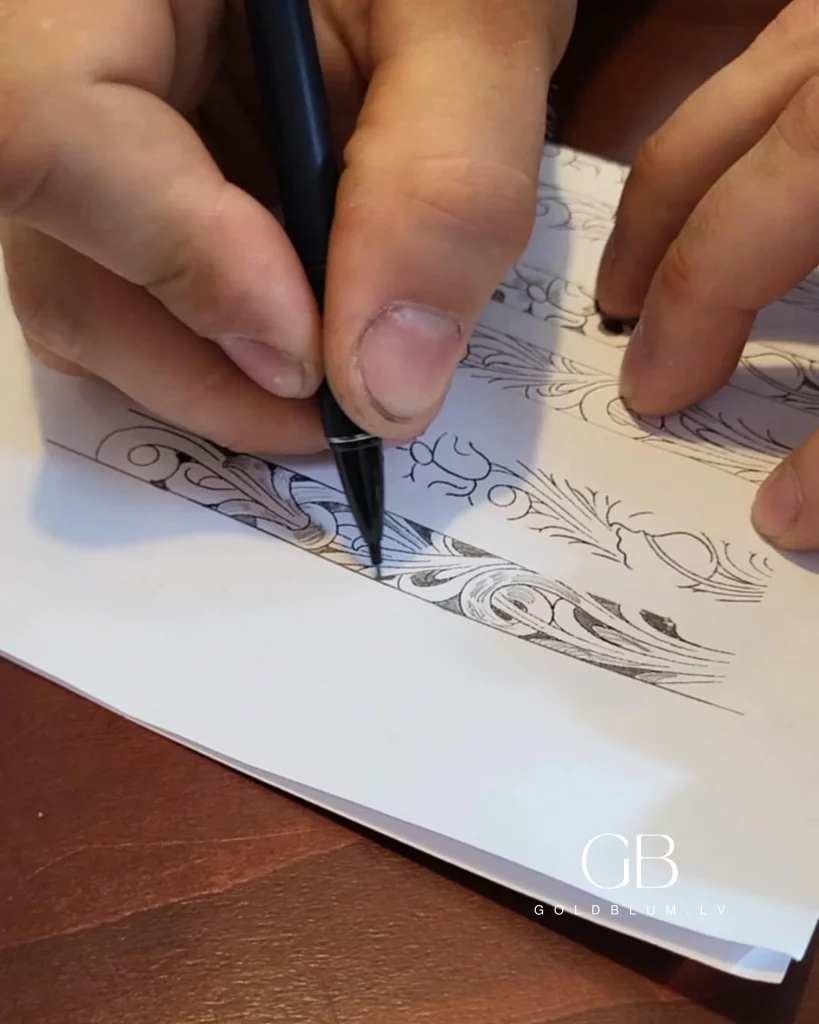 Procesu sākām ar maketu, ko saskaņojām ar pāri. Pēc tam ar lāzeri izveidojām smalku trafaretu – lai gredzenos pārnestais raksts būtu precīzs un saglabātu visas nianses. Tikai tad rotzinis Mikus ķērās pie rokas darba – ar zīmuli uz papīra atzīmējot vietas, kurās gravējums būs dziļāks, un soli pa solim veidojot rakstu tieši mgredzenos.